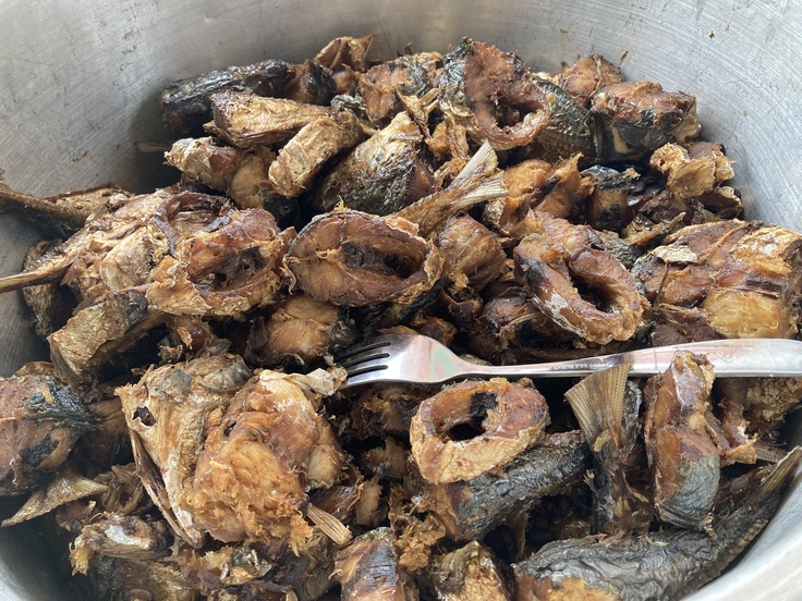 サバフライ(魚20kg)、トマトと玉ねぎマリネ、主食ギー、ビサップジュース、水