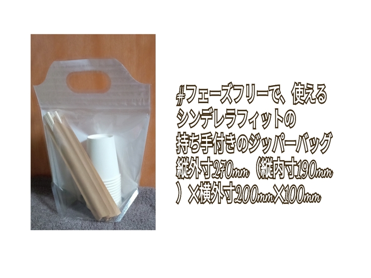 割り箸や、紙コップ、マスクなどを衛生的に収納、保管できるジッパーバッグが、ないため、もし、そのようなジッパーバッグが、あれば、快適に過ごせると思います。市販のジッパーバッグは、割り箸、紙コップが、入るサイズが、ないことや、ジッパーバッグの側面の強度が、弱いため、長期での使用ができませんでした。しかし、サイズ、強度が、あるシンデレラフィットの持ち手付きのジッパーバッグをフェーズフリーで、使っていただきたいと思いました。