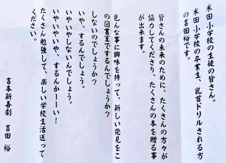 ↑米田小学校応援大使 吉田裕さんから寄せられたコメント