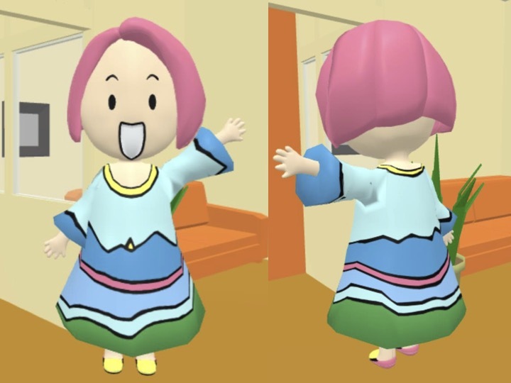 松本の中学2年生は、松本市観光大使・漫画家の鈴木ともこさんデザインのキャラクター「ばーちゃるKayo-san」を3D化しました。ちなみに、「ばーちゃるKayo-san」は実在の松本市民の方で、Kayo-sanの音声モデルをAIに学習させ、空間内でいつでもKayo-sanとお話ができる体験を提供しました。