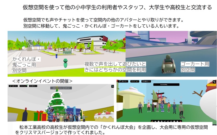 バーチャル空間の一番の魅力は、自己表現の新たな場であることです。今回、松本の子どもたちの活動を支援する取り組みを3つ実施することを目的にプロジェクトを立ち上げました。
