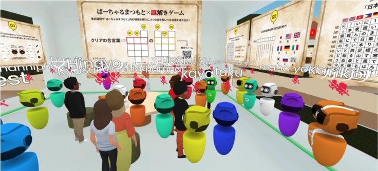 信州大学では、留学生と国内学生がともに学び合う国際共修を、信州の地域資源を活かしたプログラムを中心に展開しております。その一つとして、「ばーちゃるまつもと」を活用した謎解き授業を実施しました。30名ほどの初対面の学生がチームを組み、「ばーちゃるまつもと」でヒントを探したり、リアル商店街に行くことで答えを見つけたりして交流を育みました。バーチャル空間を活用した授業コンテンツの可能性が拡がりました。