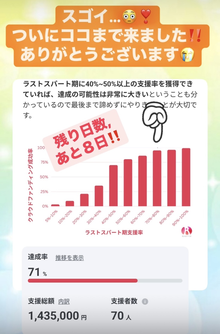 READYFOR担当者さんいわく、終了5日前を『ラストスパート期』というそうですが、それまでに目標達成率75%(150万)まできていれば、かなりの確率で目標が達成されるそうです。