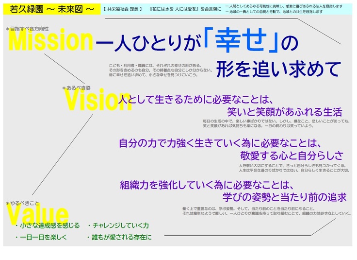 こども、利用者が「幸せ」になることはもちろんのこと、職員も「幸せ」でなければ、よい支援は提供できないと考えています。それぞれの「幸せの形」を求めていくことが、最終目標です。