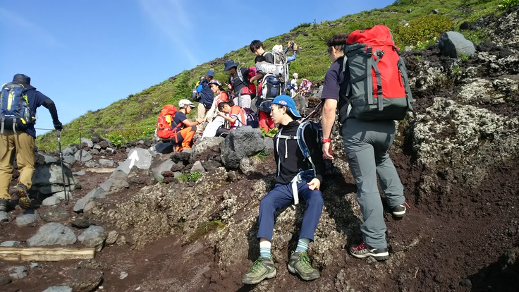 富士登山本番は、天候にも恵まれ、チャレンジ開始。8合目までは順調に子ども達も登っていましたが、3000Mを超えたあたりから高山病の症状が出だし、ペースダウン。ゆっくりゆっくりと歩を進め、何とか頂上の社までは登ることができました。