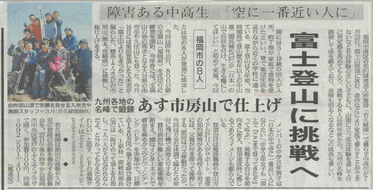 福岡市の障がい児入所施設の子ども達が、九州各地の山々でトレーニングを行い、日本一の山『富士山』にチャレンジする壮大な計画。