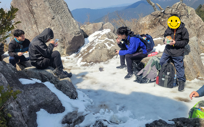 一歩一歩、歩を進めながら山頂を目指します。約3時間かけて山頂へ到着。山頂からの景色は最高でした。とてもおいしいカップ麺を食べて、2時間かけて下山。休憩も含めてトータル6時間の長旅でした。