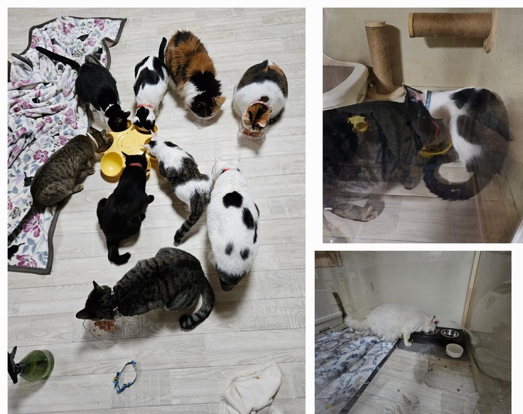 おなかの調子も良くなり、おかわり続出…成猫たちは安定した食欲ですが子ニャンたちはとにかく良く食べます。次いでシルクくんは食欲旺盛…お薬と注射で安定している時は特に良く食べます。でも体重は増えない…隔離個室とはいえお部屋は横3m 高さ1.5m 位あるので