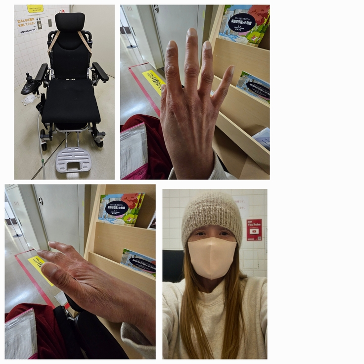 外出時の私の相棒である車椅子…右て指の関節炎で指が、真っ直ぐに伸びなくなっております。ここでは、腎臓分泌内科、泌尿器科にかかっております。
