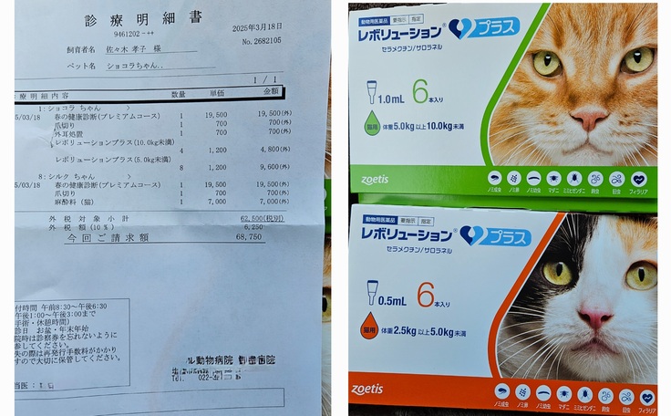 15時のお迎え…猫AIDSのシルクくんは腎臓が少し肥大している。口内炎で奥の方でも炎症…歯については元々事故の影響等で3本ですが食事が取れている事もあり引き続きお薬投与、ショコラちゃんは耳の形が特殊な為奥にダニが…鼻のズピーズピーも慢性鼻炎だからネとお薬投与継続です!2🐱の血液検査はセンターへ出すため結果は次回カルアちゃん達の健康診断の時に説明が有ります。みんなが仲良しなので全員分のレボリューションプラス処方されました。健康診断とお薬で68,750円でした!