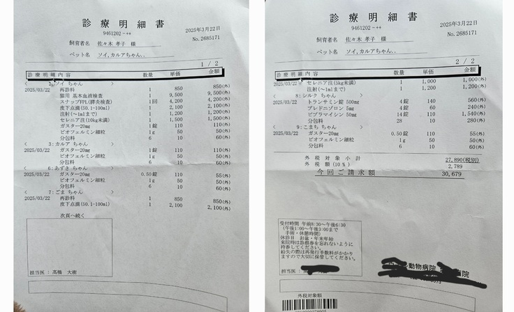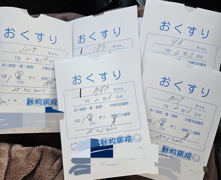3日後の健康診断ソイくんはキャンセルになり症状改善しなければ受診、カルアちゃんは予定通り健康診断、ゴマちゃんは点滴、注射と診察です。カルアちゃん、こまちちゃん、あずきちゃんも嘔吐症状有るため胃薬処方、シルクくんは抗炎症薬処方。今日の医療費、30,679円でした。