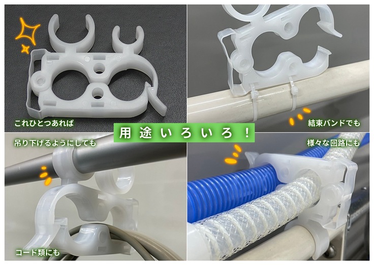 - 大/小2個のC形状グリップ部でベッド柵や円筒状の支柱などに取り付け可能