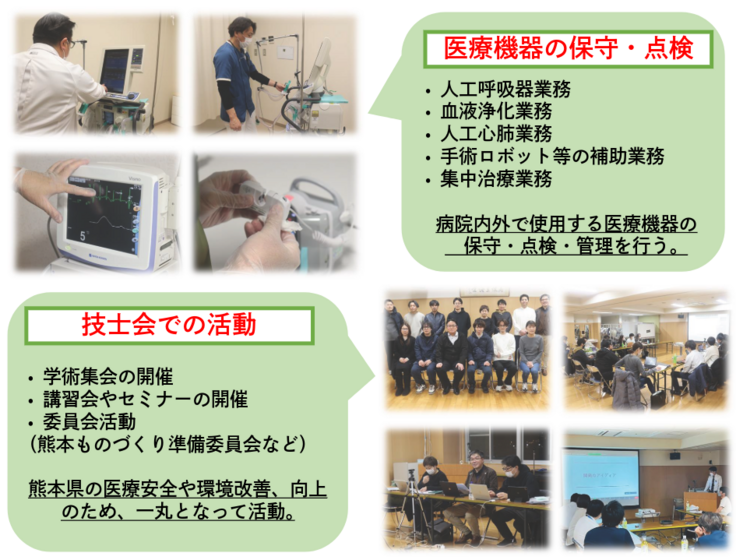 一般社団法人熊本県臨床工学技士会は平成5年5月に発足し、今年で創立30周年を迎える会員数570名の職能団体です。臨床工学技士は医学と工学の専門的な知識や技術を学び、血液浄化(透析)装置や人工呼吸器、人工心肺装置などの生命維持管理装置の操作や、医療機器の保守・管理を主な業務とする医療技術者です。コロナ禍では人工呼吸器の管理やECMOの導入など、チーム医療の一員として患者様の治療に関わりました。