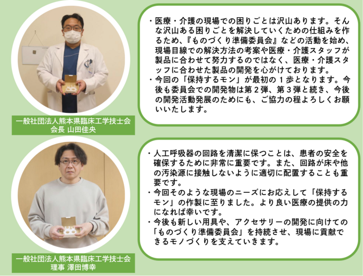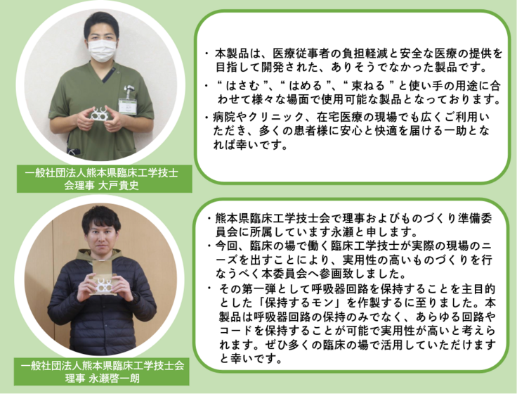 私たち一般社団法人熊本県臨床工学技士会の「熊本県ものづくり準備委員会」は、いのちのエンジニアとよばれる熊本県内の「臨床工学技士」が中心となり、医療現場で必要とされる新たな処置具や補助具などの開発を目標に商品開発に取り組んでいます。