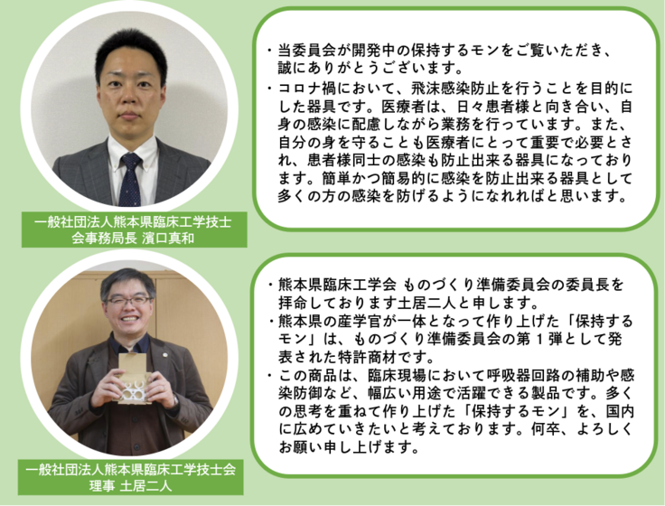 熊本県内、九州県内の医療・介護・福祉施設又、全国47都道府県の臨床工学技士会に「保持するモン」を配布(合計約700個)