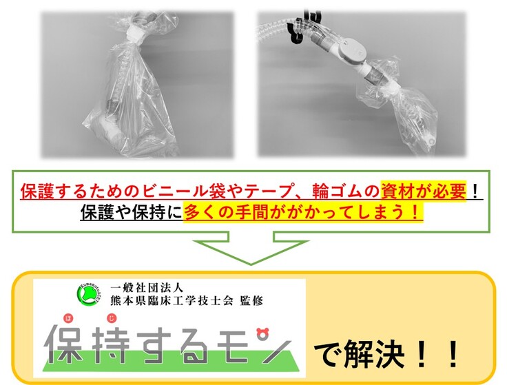 本プロジェクトでは人工呼吸器回路(蛇管)を固定する「保持するモン」の製造・配布費用の支援をお願い致します。現在、医療施設や在宅医療にて呼吸回路を使用する場合の問題点として、呼吸回路を一時的に取り外した際に、回路先端部などが不潔になる可能性があります。このため、回路を一時的に保持するサポートアームが販売されていますが、高価であり使用する人工呼吸器の機種により異なる商品を購入しなければなりません。また、在宅で使用する人工呼吸器、CPAPや在宅酸素療法(HOT)などでは設置スペースも限られているため、サポートアームと比較し小型な製品が望まれています。