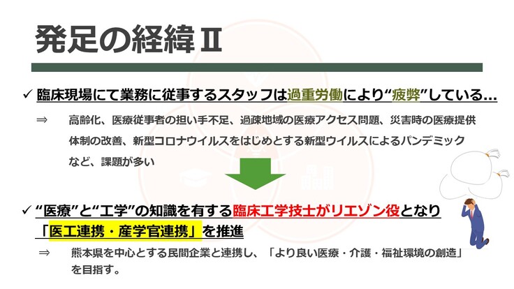 患者様の治療に携わる中で、看護師をはじめとする医療従事者から業務の効率化や医療事故を未然に防ぐ方法などの様々なアイデアやニーズを伺うことがありました。私たちはこういった声をもとに、患者様へ安心・安全な医療を提供するために臨床工学的な視点から、それらの発想を具現化したいと思い「熊本県ものづくり準備委員会」を立ち上げました。