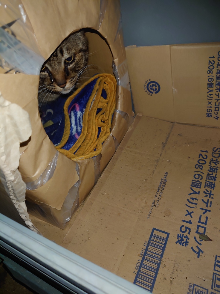 段ボールハウスがある仔は長生きしてます。ミー君も目の病気なのかずっと涙が