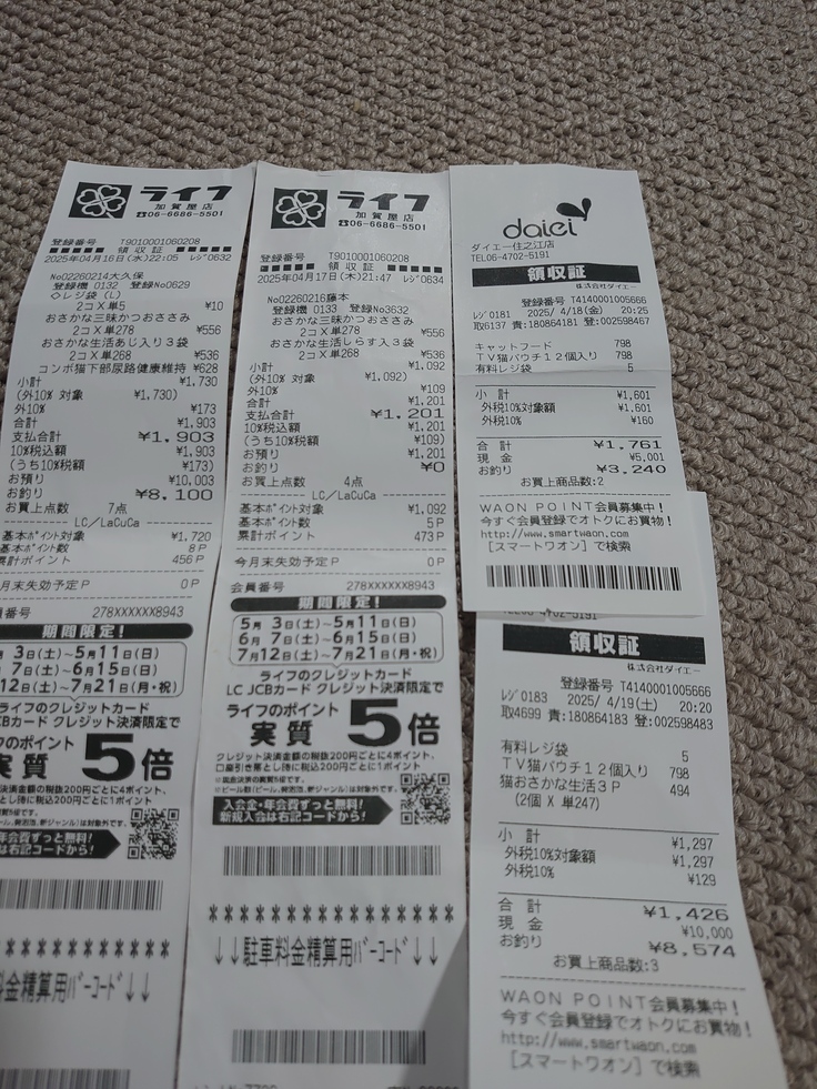 続きです。総合計はまとめて最後に出します。昨日買った物は品物と