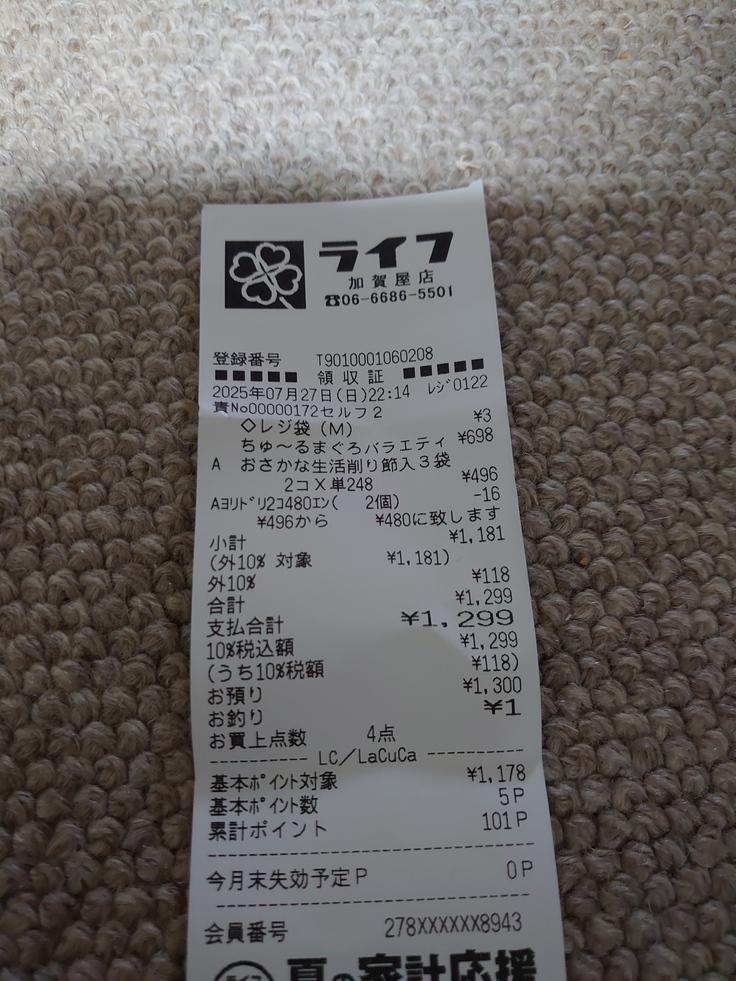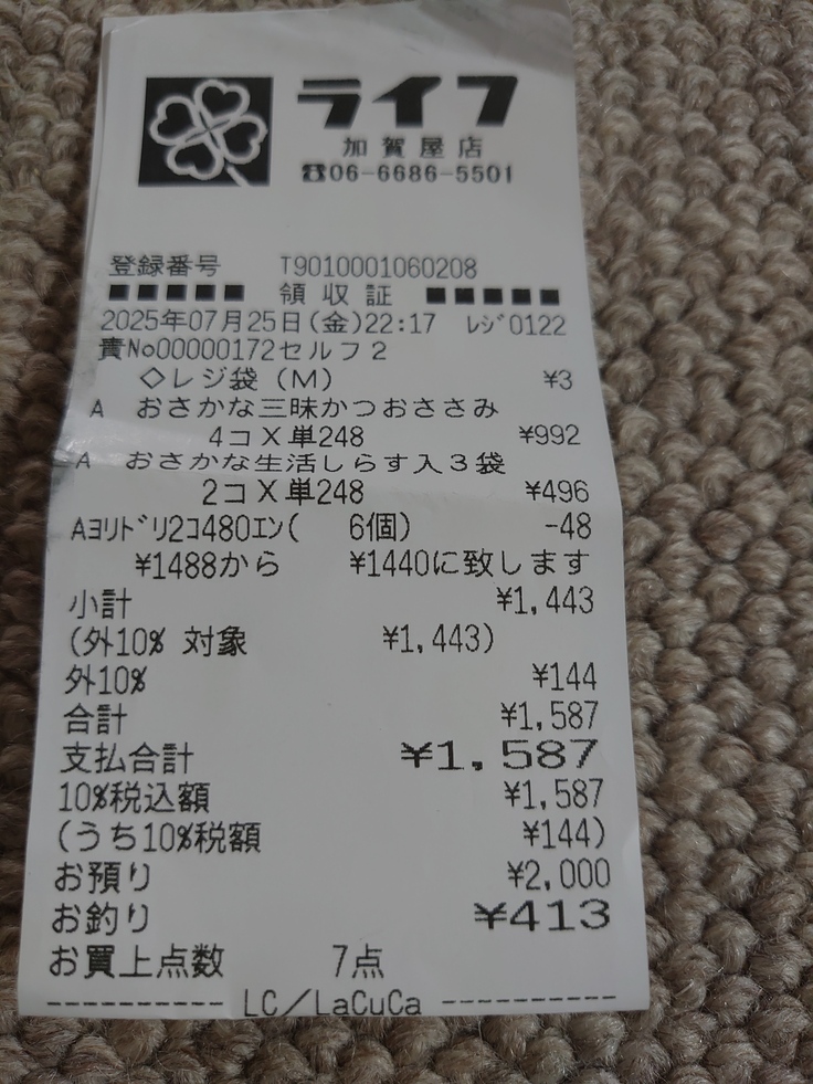 レディフォーより振込額617574購入品、TNR費用2匹−616867=残金707円。