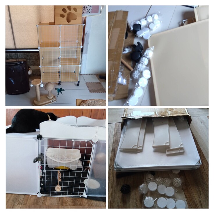 まだ ウイルス検査ができません そのためファスナーテントに入れてましたが強い子は開けてしまいますので、子猫用ゲージを2台購入しました。成猫に購入予定だったパネルを 継ぎ合わせ3畳ほどの大きなゲージで規定の縦横高さ猫の体型の4倍にするつもりでしたが子猫用のパネルゲージを購入したら中国製で、成猫には、もろく耐えれない耐久性でした。