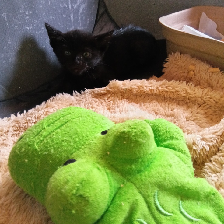 目の前は4車線の大通りで危険と思い、考える前に車をパーキングに止め 子猫の元へ、姿が見えたのは、400g ぐらいのしっぽの長い黒猫ちゃん。通りすがりの優しい方が声をかけてくださり、コンビニでお皿とチュール🥹を買ってきてくださいました。最初は警戒してたがお腹が空いていたのか 勢いよく食べており、その隙にパッと 捕まえられました。