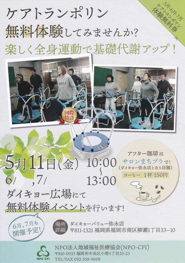 NPO法人地域福祉医療協会の活動としては、弥永校区自治協議会と共同で、ダイキョープラザ弥永店イベント広場にて、5月11日「ケアトランポリン」の健康運動を開催します。 併せて改修工事が終わった「サロンまちプラ」で、コーヒーサービスなどを予定しており、多くの方が来られること楽しみにお待ちしています。
