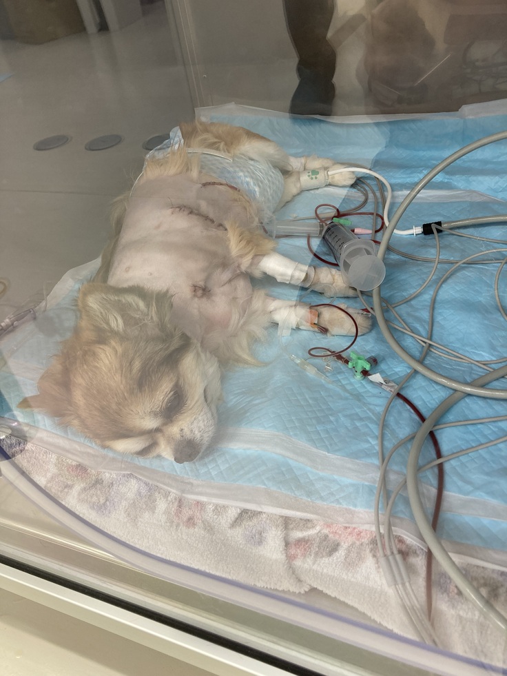 初めから聞かされてはいましたが、毛も前半分程剃っていて覚醒もしていません。術後はみんなこの状態になるので心配はないとのことでした。この姿はショックでしたが、元気になるためには手術しかないので見守ります。