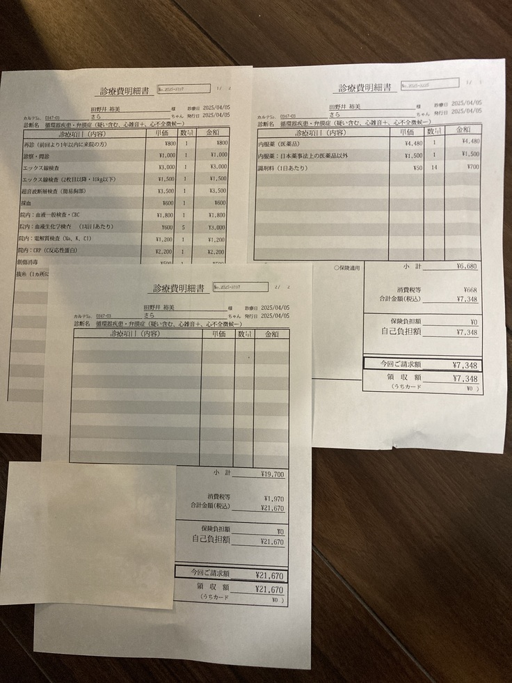 今日の検査費用と1ヶ月検診の4月22日までの間のお薬代をアップさせて頂きます。手術費用や入院費用以外にも通院費がかかり、今後の定期検診にあわせてクッシング症候群や腎臓の石の診察も続きます💦治療費はかかりますが、治療できる病気である限りどうしても元気でいて欲しいです。諦められません。