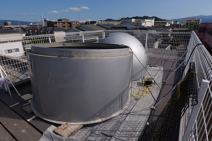 最後に、赤道儀の柱を取り外しました。観測室である円筒底面のコーキング剤を剥がし、半円のドームを3人がかりで降ろしました。その後、観測室を移設。