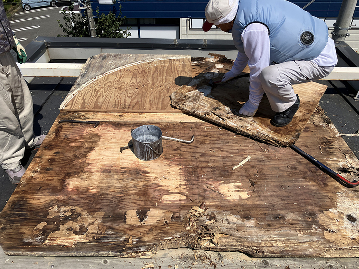 想像以上に床の腐食がありました。25mm厚の合板を2枚重ねていましたが、 1枚目はしっかり湿気を吸い変色していました。手を入れるチャンスだったことは、間違いない行動でした。
