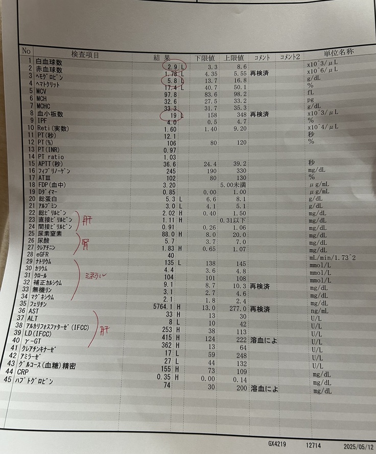 昨日の夜に舌を噛んでしまって出血、血小板が少ないので6時間ほど出血が止まらず、ヘモグロビンが5.8(正常値13.1〜16.2)まで下がっちゃいました。