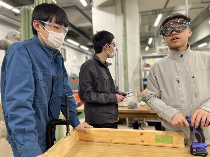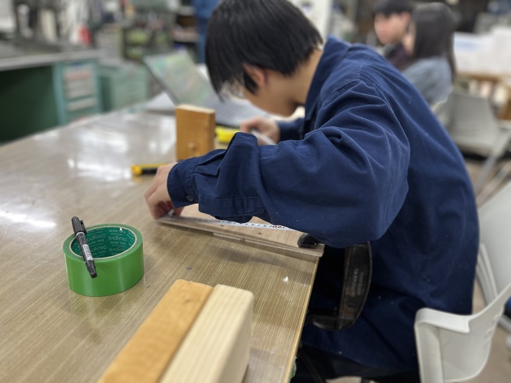まずは設計図を見ながら、板材の切り出し作業からスタート。1mmのズレも許されない緊張感の中、メンバー全員が集中して作業に取り組みました。