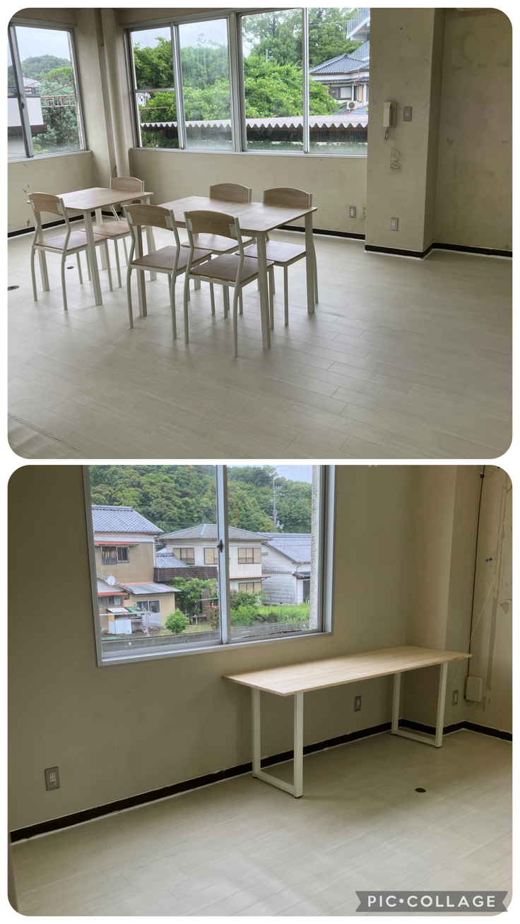 フロアマットを敷き終え、ダイニングテーブルセットが一式入りました。