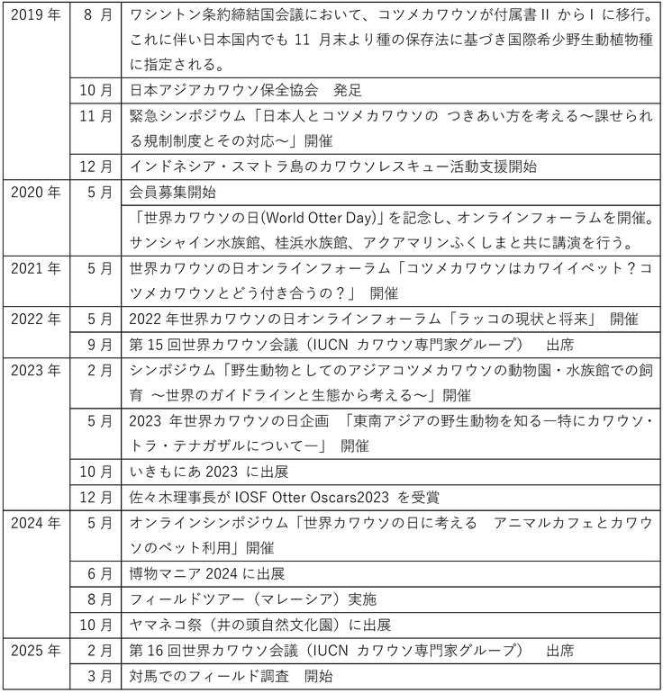日本アジアカワウソ保全協会は、アジアを中心とする世界のカワウソ保全を目的とし、研究、普及啓発、そして世界のカワウソ研究者たちとの協力をより積極的に行うため設立された非営利組織です。