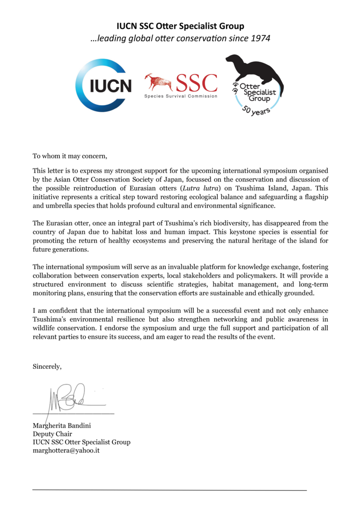 この書面は、日本アジアカワウソ保全協会が主催する、日本・対馬島におけるユーラシアカワウソ(Lutra lutra)の保全と再導入の可能性に関する国際シンポジウムに対し、私からの最も強い支援を表明するものです。この取り組みは、生態系のバランス回復と、文化的・環境的に重要なフラッグシップ種でありアンブレラ種の保全に向けた重要な一歩を象徴しています。ユーラシアカワウソは、かつて対馬の豊かな生物多様性の重要な構成要素でしたが、生息地の喪失と人間の影響により、日本国内から絶滅しました。このキーストーン種は、健康な生態系の回復を促進し、島の自然遺産を将来の世代に継承するため不可欠な存在です。国際シンポジウムは、保全専門家、地域関係者、政策決定者間の知識共有と協力を促進する貴重なプラットフォームとなります。科学的戦略、生息地管理、長期モニタリング計画に関する議論を構造化された環境で進め、保全努力が持続可能で倫理的に正当化されたものとなるよう確保します。私は、この国際シンポジウムが成功裡に開催され、対馬の環境レジリエンスを強化するだけでなく、野生生物保全におけるネットワーク強化と一般市民の意識向上にも寄与すると確信しています。シンポジウムを支持し、関係者の皆様の全面的な支援と参加を強く呼びかけ、イベントの結果を楽しみにしています。