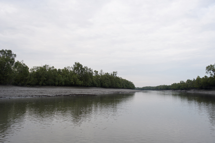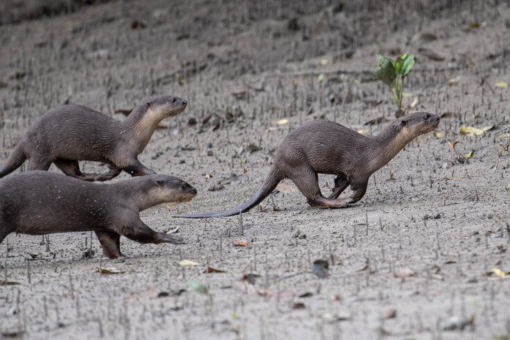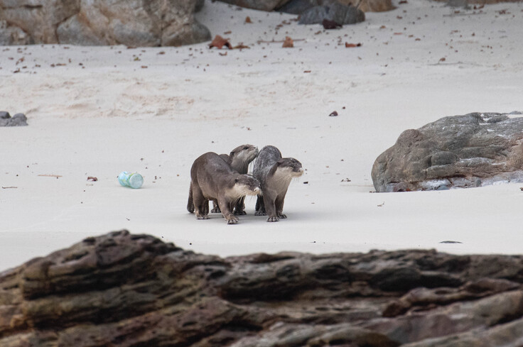 2016年から2020年にかけて、現地のローカルNGO(MEIF: Myanmar Environmental Innovation Foundation)、Myeik大学の研究者、学生らと、タニンダーリ地方域が面するアンダマン海のメルギー諸島でビロードカワウソについて調査と保全活動を行っていました。ここでは、ビロードカワウソは、昼間活動しているのを観察することができます。生息環境は広く、マングローブ地域から外洋に面した島々でも観察することができます。マングローブでは、緩慢の差が激しく、一日に5mもの潮位の変化があり、干潮時にはマングローブの泥干潟があらわれ、カワウソ達も餌を獲りに水路にやってきます。水路で餌を探しながら、泥干潟にあがって、走り回っているのを見ることができます(図2)。島に渡ると、海で餌を獲り、白い砂浜に上がって砂浴びしたり、走り回ったりしています(図3)。