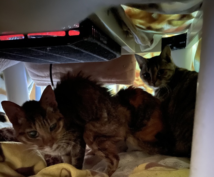 庄原市の山あい、川のそばにある我が家は、数日前まで朝はまだひんやりしていて、保護猫たちはおこたの中でぬくぬくしていました。