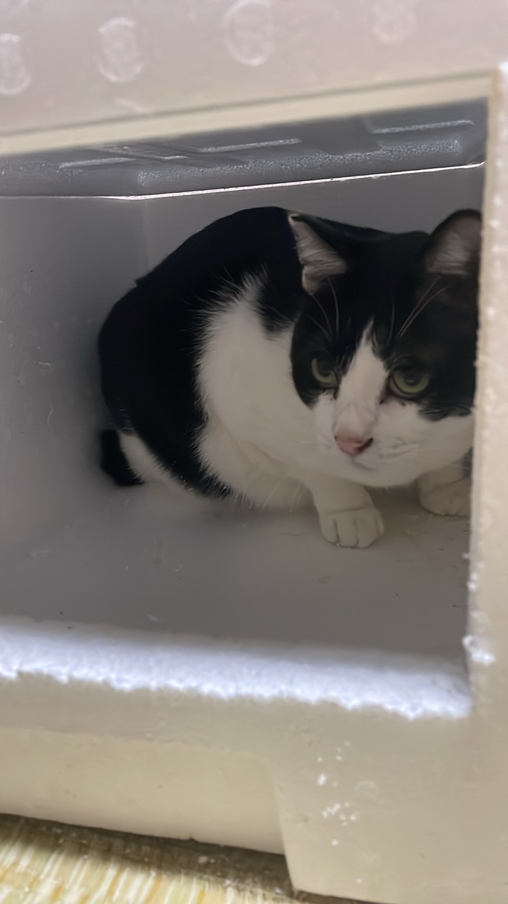 先日支援者のかたからいただいた発泡スチロールをくり抜き、地域猫さんの寝床を更に暖かくしていきます。