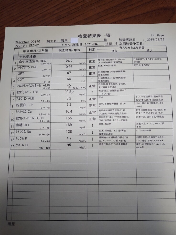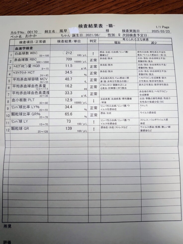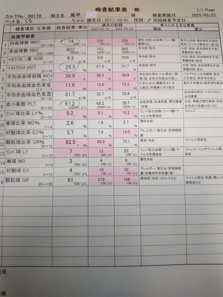 白血球数が少しは、下がりましたが、原因を突き止める為に、胸水を病理検査に出して頂きます😰FIPの可能性も…