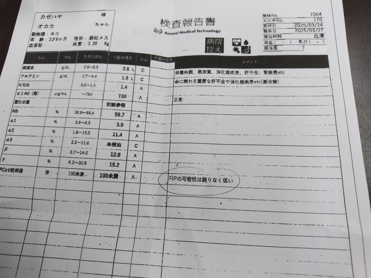 工場猫ハウス おかかちゃんの病理検査の結果、おかかちゃん FIPの可能性は、限りなく低いと診断されました😻