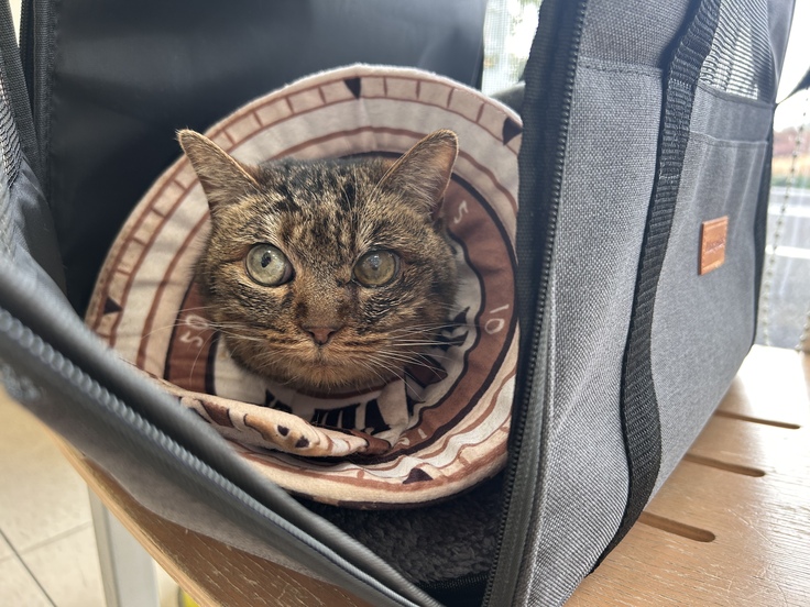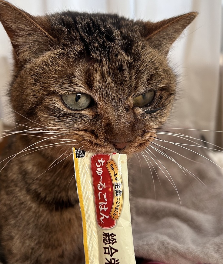 食欲はとにかくに旺盛で,毎日70gのフードとチュール1本をペロリと完食します。朝の6時には,「ごはん!ごはん!!」を言わんばかりの熱い目線が飛んできます。(ジンナイの一日は,みっちゃんの薬の投与,おトイレ掃除とご飯の準備から始まります。)