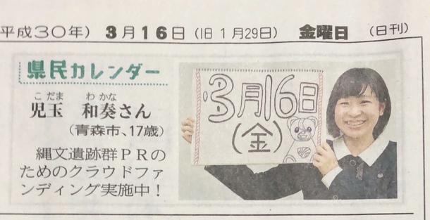 本日の地元紙『東奥日報』夕刊にて、クラウドファンディングを少しだけPRしました! スケッチブックに日付とイラストを自由に描いていいとのことだったので、3月の3は縄文土偶の顔(横向き)をイメージして描いてみました^_^ 右端には小牧野遺跡イメージキャラクターのこまっくーがいます。 引き続き応援・ご支援よろしくお願いいたします!