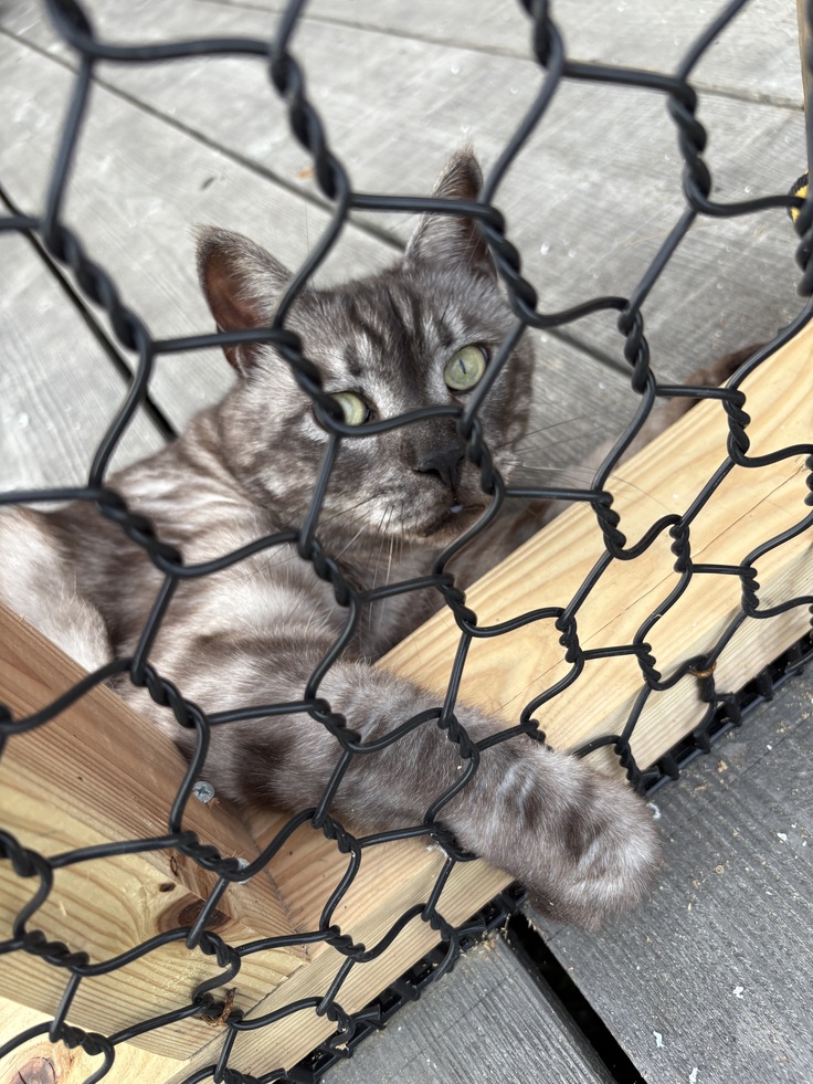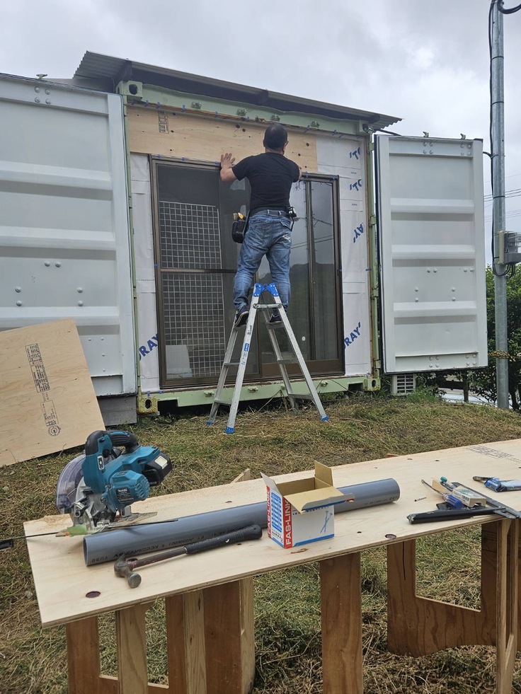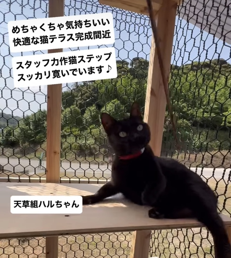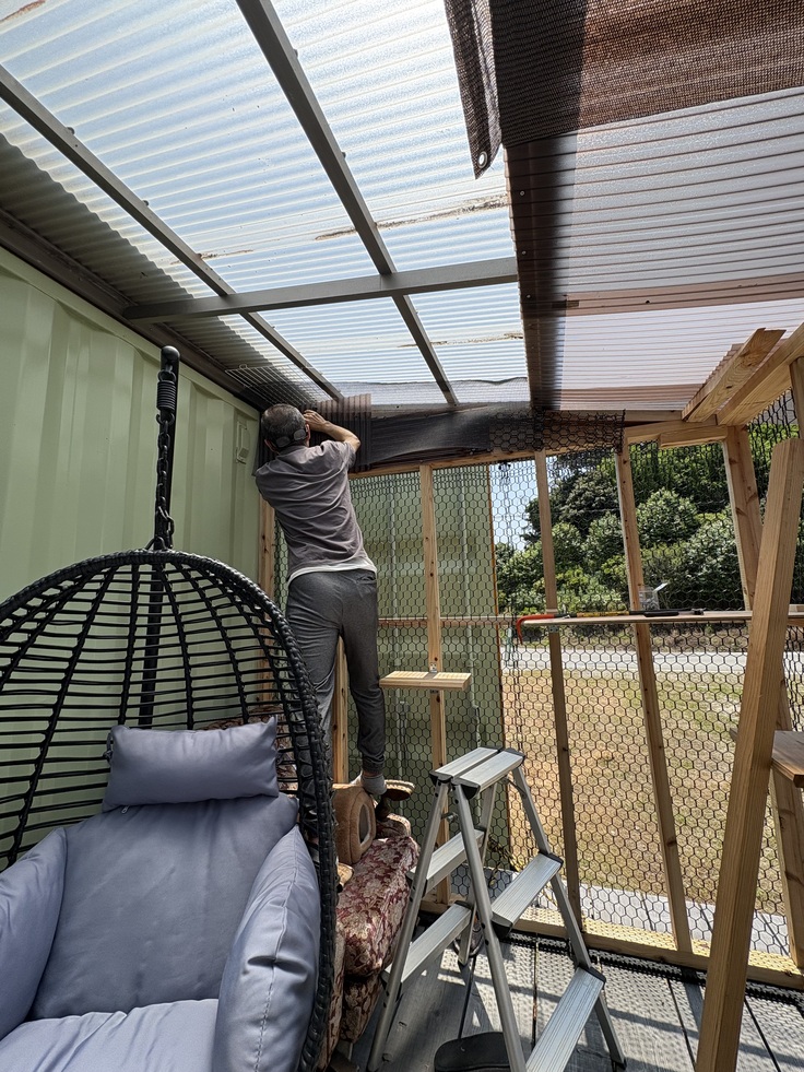 猫テラスの細部から脱走防止対策のDIY中のボランティアさん