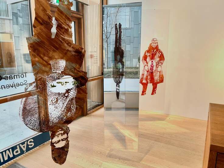 2-1. スウェーデンの先住民族サーミのアーティスト、トーマス・コルベンソンは、同じコミュニティの先祖の人々をスウェーデンの人種生物学者が撮った大量の古い写真の中から探し出し、故郷の風土を背景に紙やメタルの上あるいはガラスの中に蘇らせてきました。たとえば、20世紀初頭、サーミの組織を初めて創設した同郷のサーミ女性、エルサ・ラウラ・レンバーグを度々作品にし、彼女に永遠の命を吹き込んでいます。トーマスの作品はいずれも、教科書の中の国家中心の歴史では描かれない先住民族固有の歴史を今日につづくものとして、見る者の記憶に焼きつけるのです。なお、トーマスは、今日まで欧米はもとよりブラジル、日本など20か国以上で展覧会を開き、2024年には、世界の版画界で最も重要な賞であるソニア女王版画賞を受賞しました(https://www.queensonjaprintaward.no/news/sami-artist-wins-worlds-most-important-prize-for-printmaking#:~:text=Sonja%20Print%20Award-,Tomas%20Colbengtson%20is%20the%20winner%20of%20The%20Queen%20Sonja%20Print,most%20important%20prize%20for%20printmaking.)。