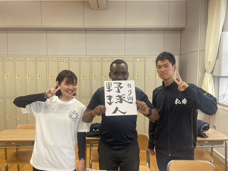 五日目は、日本文化を体験する特別な日となりました。午前中は、野球部マネージャーによる書道教室が開かれ、アルファ選手は見事「野球人」という力強い文字を書き上げました。さらに、マネージャーの発案で、アルファ選手の音にちなんだ「有歩阿(あるふあ)」という粋な当て字も贈られました。