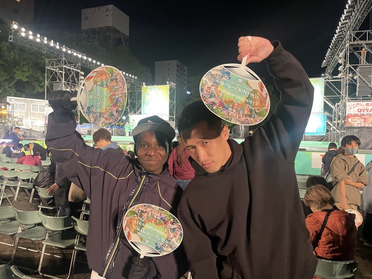 夜には、四方田さんと共に北海道の伝統的な祭りであるYOSAKOIソーラン祭りへ。祭りの熱狂に身を委ねるアルファ選手は、見よう見まねで踊りのステップを踏んだり、うちわを振って楽しんでいました。さらに、演舞後の皆さんにも記念写真を撮っていただき、アルファ選手にとって忘れられない思い出の一つになったようです。