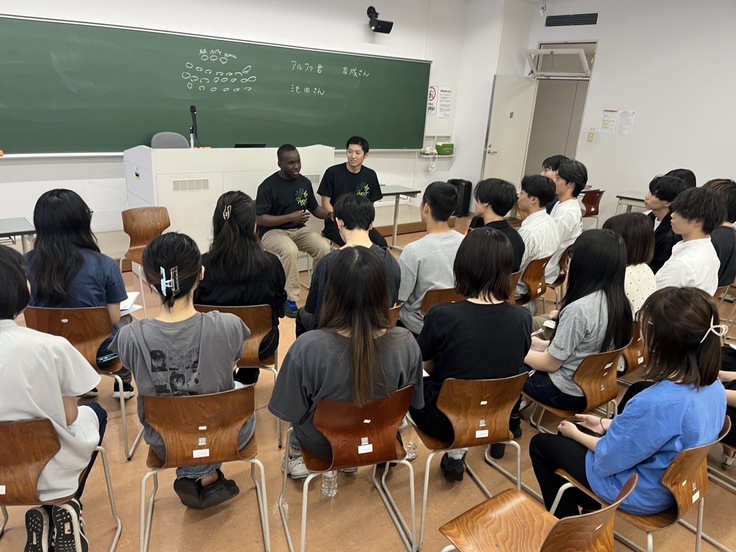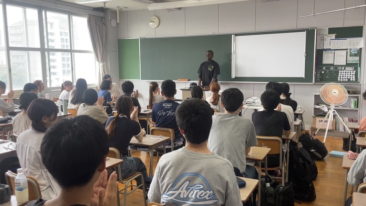 また、文化交流も怠らないアルファ選手。朝から全日制での英語の授業、夜は定時制での体育の授業に参加し、他大学での国際交流特別講義にも登壇いたしました。