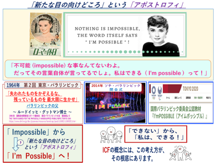 私たちの身の回りのいたるところで起きている「できない・制限されている」状態。そんな社会にあって、ICFは「プラスの視点で向き合うこと」、「ポジティブに改善していくこと」を提唱しています。