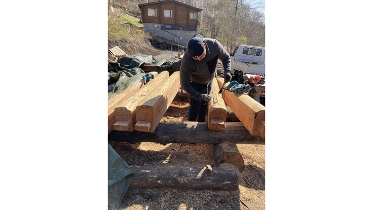 この作業場で一度仮組みをした後、バラシて、ログサウナ設置場所に運んで本組みをします。